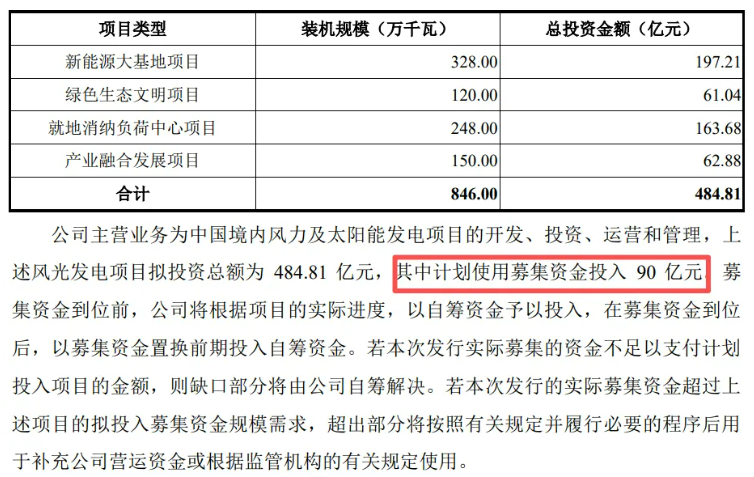 本次募集资金将投入风力发电、太阳能发电项目建设,拟使用募集资金约90亿元。
