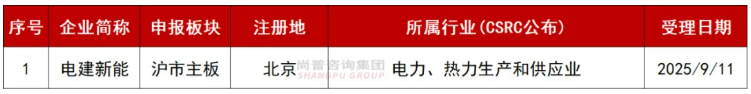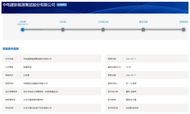 2025年9月11日,电建新能沪市主板IPO申请获受理,保荐机构为中金公司,审计机构为信永中和,律师事务所为嘉源。