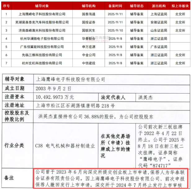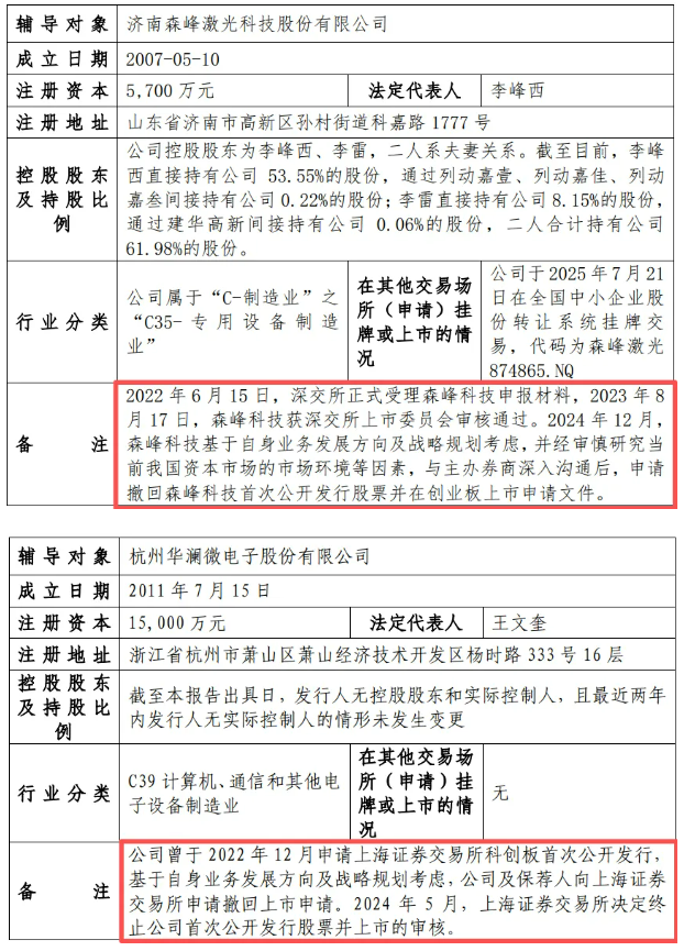 本周7家企业启动辅导备案,其中鹰峰电子、森峰科技曾申报过深交所创业板,后均以撤回告终,此次2家企业再度申报IPO,改道北交所;华澜微曾申报过上交所科创板,也以撤回告终,此次为二次申报。