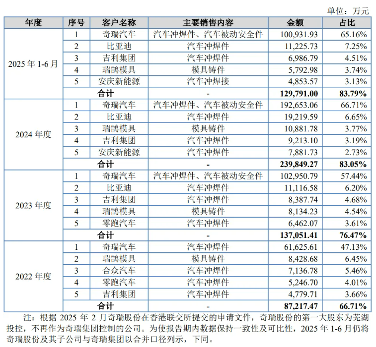 目前,公司主营业务产品应用于汽车制造业,主要客户群体为汽车整车生产企业和汽车零部件企业。报告期内,公司向前五名客户销售收入占当期营业收入的比例分别为66.71%、76.47%、83.05%和83.79%,其中,向奇瑞汽车的销售收入占当期营业收入的比例分别为47.13%、57.44%、66.71%和65.16%。公司客户集中度相对较高,特别是向关联方奇瑞汽车的销售占比较高。