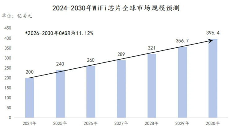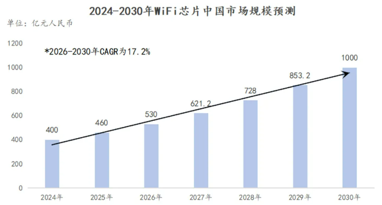 2030年中国WiFi芯片市场规模将达1000亿元人民币。