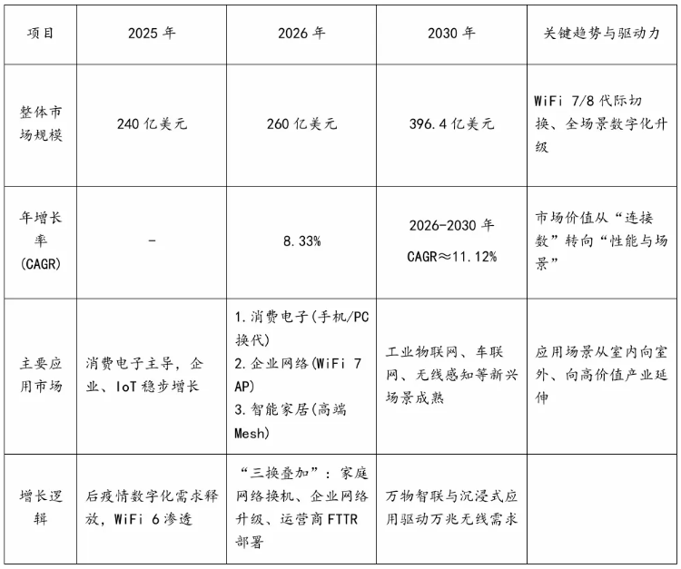 WiFi芯片市场正处于“技术换代+格局重塑”窗口期,2026-2030年将保持11.12%的高速增长,WiFi 7与物联网是核心增长引擎。中国市场凭借制造优势与政策支持,成为全球增长最快的区域,但高端芯片自主化仍是关键命题。企业需聚焦技术研发(WiFi 7/8预研)、场景定制(工业/IoT)与供应链韧性,把握国产替代机遇。