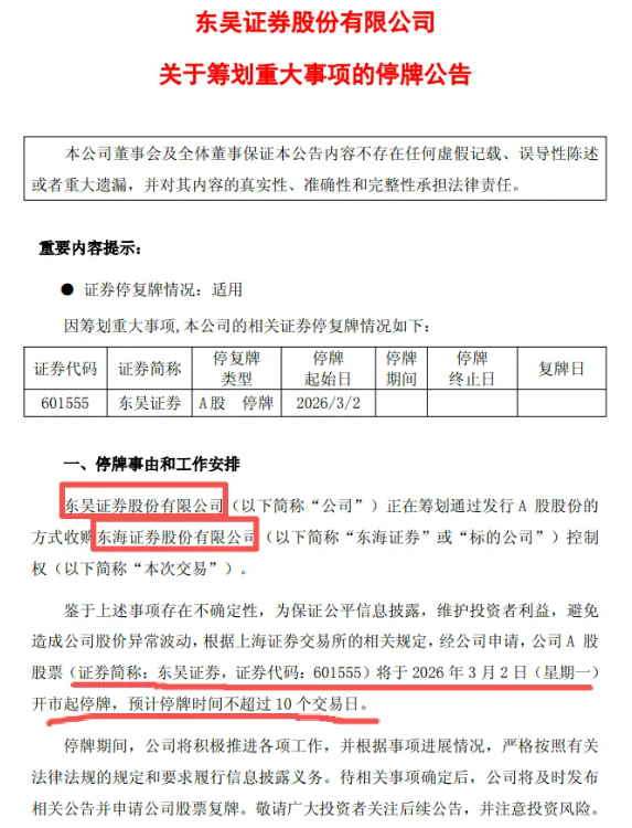 3月2日早间,东吴证券发布公告,宣布筹划通过发行A股股份方式收购东海证券控制权,两家江苏本土老牌券商迎来战略整合。东吴证券股票自3月2日起停牌,预计停牌时间不超过10个交易日,一场聚焦长三角的券商资源整合大幕正式拉开。