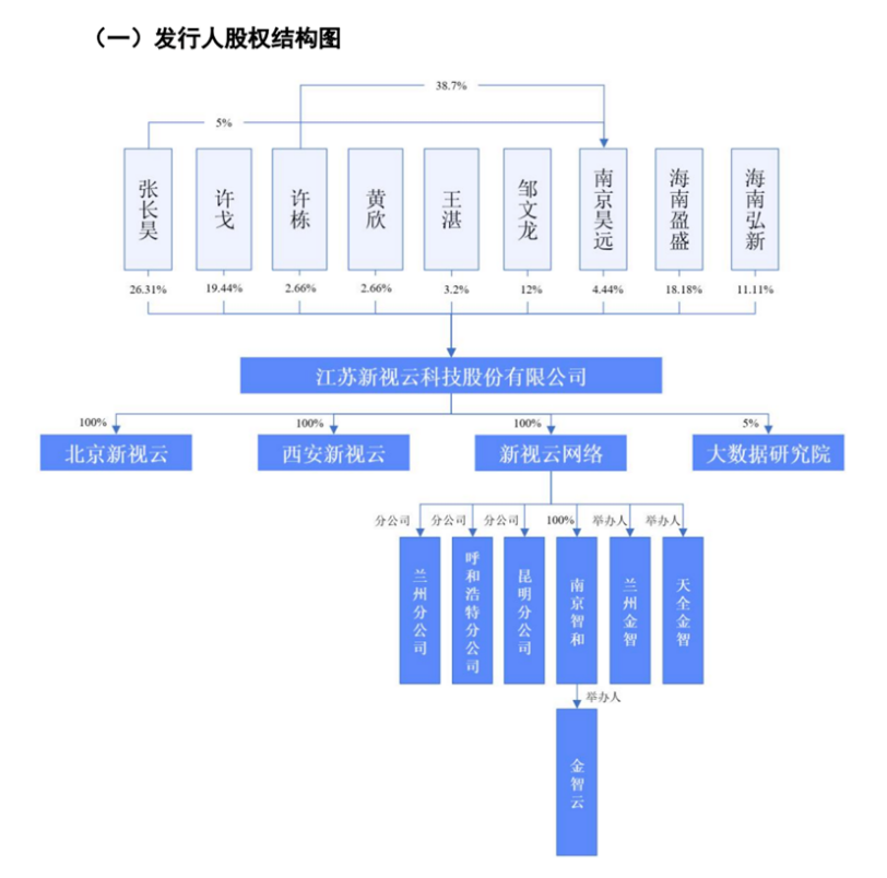 此次IPO,新视云依旧保留了上次的原班人马,保荐机构依旧是华泰联合证券,会所为中天运,律所为世纪同仁。根据新版招股书显示,公司是国内领先的面向法院信息化的综合服务提供商,通过自主研发的软硬件设备及互联网平台为法院提供庭审公开、智能法庭等智慧法院建设的综合解决方案,协助各级法院以信息技术提升司法的公正与效率。新视云的主营业务包括庭审公开、智能法庭和其他智慧法院业务三大类。本次上市前,张长昊直接持有新视云26.31%的股权,通过南京昊远持有该公司0.222%的股权,合计控制公司55.51%的表决权,是公司的实际控制人。