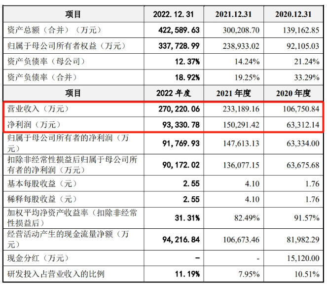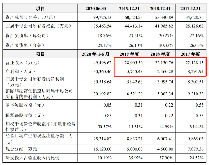 根据公司2020年申报材料显示,公司2017年至2019年营业收入分别为2.21亿元、2.21亿元、2.89亿元;净利润分别为8,291.97万元、2,460.28万元、5,745.49万元。即申报时,最近一年净利润仅不足6,000万元。