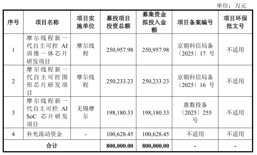 此次科创板IPO,摩尔线程拟募集资金80亿元,成为年内募资规模最大的IPO上会项目。所募资金将用于摩尔线程新一代自主可控AI训推一体芯片研发项目、摩尔线程新一代自主可控图形芯片研发项目、摩尔线程新一代自主可控AISoC芯片研发项目及补充流动资金。
