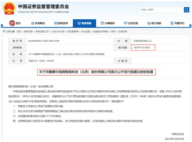2025年10月30日,证监会官网显示,摩尔线程智能科技(北京)股份有限公司(简称“摩尔线程”)科创板IPO注册生效,公司保荐机构为中信证券,审计机构为安永华明,律师事务所为竞天公诚。尚普咨询为摩尔线程此次IPO提供了募投项目可行性研究咨询服务。