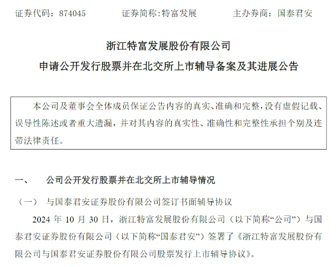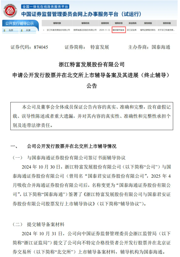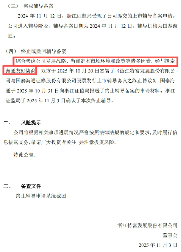 2025年11月3日,特富发展(874045)公告称,综合考虑公司发展战略、当前资本市场环境和政策等诸多因素,经与国泰海通友好协商,双方于2025年10月30日签署了《浙江特富发展股份有限公司与国泰海通证券股份有限公司股票发行上市辅导协议之终止协议》,国泰海通于2025年10月31日向浙江证监局报送了终止辅导备案的申请材料。浙江证监局于2025年11月3日确认了本次终止辅导。
