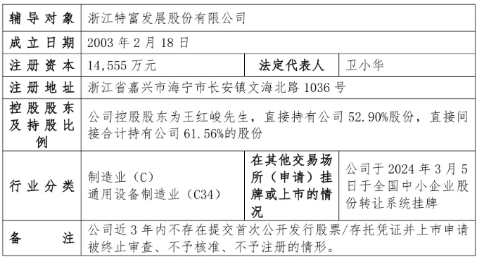 值得一提的是,早在2021年11月公司与国泰君安便签署了上市辅导协议,拟主板上市,IPO辅导验收完成后,公司改道北交所,最终还是撤回辅导备案申请材料。特富发展是目前中国规模较大、产品线最齐全的环保锅炉产品生产企业之一。公司股票于2024年3月5日正式挂牌全国中小企业股份转让系统,证券代码为874045。公司的主营业务为从事各类燃气、电能、氢能等洁净能源热能装备的设计、研发、生产和销售,并可为客户提供热能系统的设计、安装、调试和维护服务。公司的主要产品分为工业锅炉和商业锅炉两大类,并开始向热储能装备、多能互补和储能系统等新兴领域发展。目前,公司已成为中国石油、中国石化、雄安集团、贵州茅台、中粮集团、双汇发展、比亚迪等各行业知名企业的热能装备供应商。特富品牌被中国电器工业协会锅炉分会评为锅炉行业最具影响力品牌和中国燃油气锅炉行业最具领导力品牌之一,公司被中国电器工业协会锅炉分会评为2021年度中国工业锅炉行业十强企业。公司控股股东为王红峻,其直接持有公司52.90%股份,直接间接合计持有公司61.56%的股份。实际控制人为王红峻、卫小华兄弟二人,二人合计控制公司92.8%的表决权。2021年11月23日,特富发展上市辅导备案申请材料获浙江证监局受理。2023年10月31日,浙江证监局完成国泰君安对公司申请首次公开发行股票并在深交所主板上市辅导工作的验收。2024年4月30日,沪深交易所同时发布《股票上市审核规则》的最新修订版,其中一项主要修订内容是提高主板IPO企业相关财务指标的门槛。主板第一、二套上市标准的净利润、现金流、收入指标,第三套上市标准的预计市值、收入等指标均有提高。其中,将第一套上市标准中的最近三年累计净利润指标从1.5亿元提升至2亿元,最近一年净利润指标从6,000万元提升至1亿元,最近3年累计经营活动产生的现金流量净额指标从1亿元提升至2亿元,最近三年累计营业收入指标从10亿元提升至15亿元。2022年至2025年1-6月,特富发展实现营业收入分别为8.09亿元、8.44亿元、6.89亿元以及1.40亿元,实现扣非归母净利润分别为6,989.18万元、9,022.46万元、5,935.22万元以及-695.71万元。进入2024年起,特富发展业绩出现下滑。2024年修订后的上市条件,进一步拔高主板大盘蓝筹的业绩门槛,并更加强调在业绩规模上的稳定性,明确要求发行人、保荐人对主板定位进行评估研判。新规发布之后,沪深主板连续多家公司主动撤回申请终止审核,均存在净利润不达标的情况。对于特富发展来说,公司的业绩规模和经营稳定性难以达到主板要求。深市主板IPO辅导验收完成后,公司决定变更拟上市板块为北交所。公司经审计的2023年度、2022年度实现归属于母公司所有者的净利润分别为9,022.46万元、6,989.18万元,加权平均净资产收益率分别为20.51%、27.63%。预计公司公开发行股票后的总市值不低于2亿元,符合《上市规则》第2.1.3条规定的在北交所上市的财务条件。根据相关规定,虽然公司已完成辅导验收并结束辅导期,但仍需辅导机构国泰君安在对公司进行差异化辅导后,重新向浙江证监局提交辅导验收材料,履行辅导验收程序。2024年10月31日,公司提交了向不特定合格投资者公开发行股票并在北交所上市辅导备案材料。辅导机构为国泰君安,会计师事务所为天健,律师事务所为北京国枫。2024年11月12日,浙江证监局受理了公司提交的上市辅导备案申请,公司再次进入辅导阶段,开启北交所IPO之路。北交所IPO辅导了4期,最终还是撤回辅导备案材料。