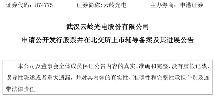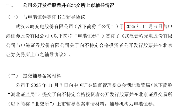 2025年11月6日,公司与申港证券签订了《武汉云岭光电股份有限公司与申港证券股份有限公司关于向不特定合格投资者公开发行股票并在北京证券交易所上市之辅导协议》。并于11月7日向湖北证监局提交上市辅导备案申请材料。