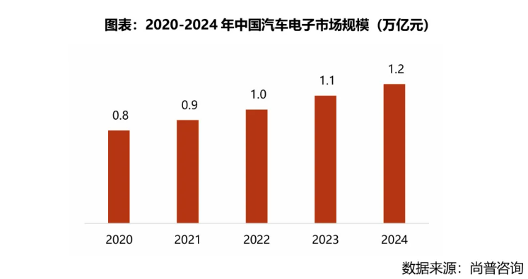 随着电动汽车的逐渐普及以及汽车电子在整车成本中的占比不断提高,我国汽车电子市场规模增速较快。根据尚普咨询整理,我国汽车电子市场规模从2020年的0.8万亿元增长到2024年的1.2万亿元,复合年均增长率为10.67%。