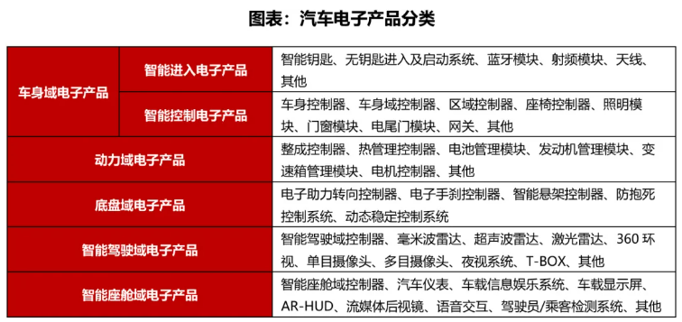 汽车电子于上世纪七十年代引入汽车工业,首次应用在发动机燃油喷射控制系统,极大改善了燃油效率。此后伴随着电子信息技术持续发展,汽车电子技术不断革新,汽车电子产品种类逐渐丰富。以智能网联汽车电子产品架构为例,根据功能与性质差异,汽车电子产品可以分为车身域电子产品、动力域电子产品、底盘域电子产品、智能驾驶域电子产品以及智能座舱域电子产品。