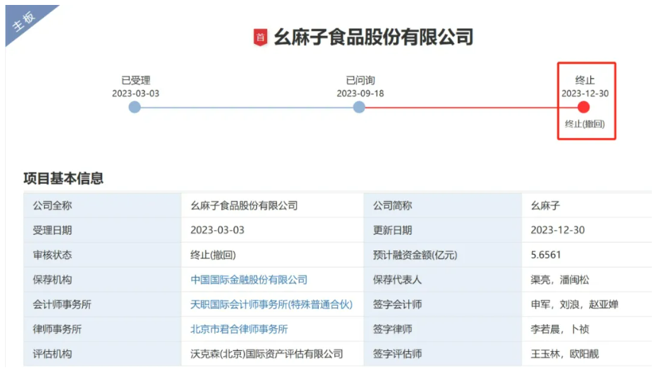 自2023年3月IPO获得深交所受理,幺麻子半年后(2023年9月)才收到首轮问询函,但从下半年开始,监管层已经开始调整IPO节奏。公司于2023年12月选择主动撤回IPO申请,终止了深交所主板上市进程。