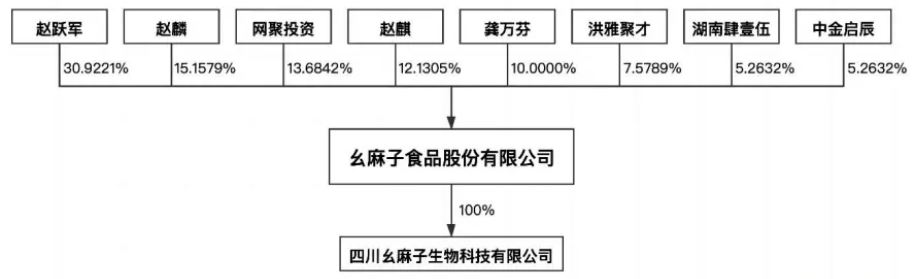 幺麻子是一家典型的“家族企业”,由创始人赵跃军、龚万芬夫妇及其子赵麒、赵麟共同控制,合计直接持股68.21%。其中赵跃军为第一大股东,直接持有30.92%的股份。此外,上市公司绝味食品(603517.SH)旗下网聚投资持股13.68%,洪雅聚才持股7.58%,中金启辰、湖南肆壹伍各持5.26%。