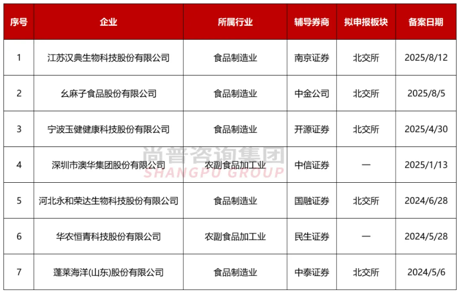 新增辅导方面,2024年以来,有7家食品行业(含食品制造业和农副食品加工业)企业IPO辅导备案获证监局受理,其中5家拟申报北交所。