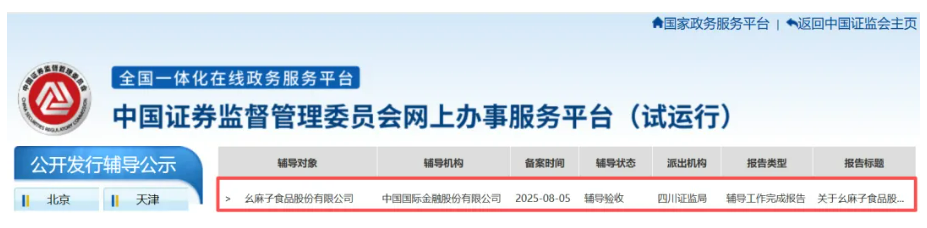 2025年11月29日,证监会网站显示,幺麻子辅导状态近期变更为“辅导验收”,申报在即。