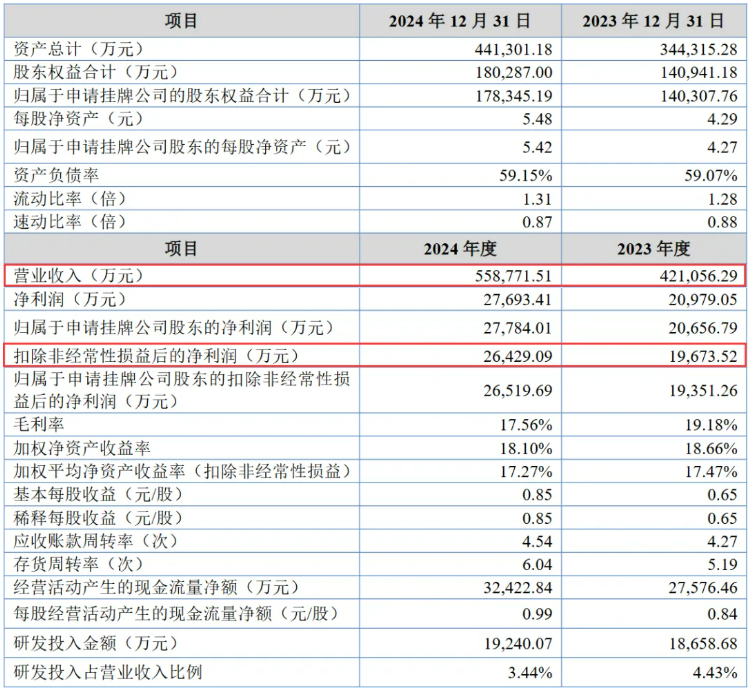 近年来,公司生产经营规模不断扩大,营业收入持续上升。2023年及2024年,公司营业收入分别为42.11亿元、55.88亿元;扣非后净利润分别为1.97亿元、2.64亿元。