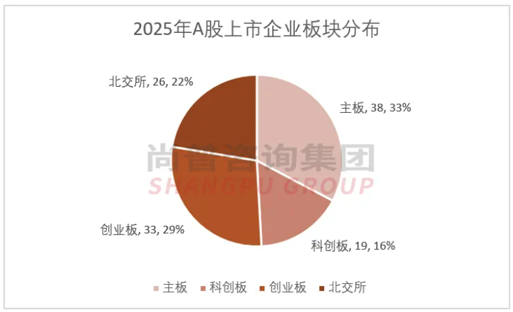 据尚普君统计,2025年共有113家IPO企业上会(二次上会按最终结果统计),111家企业获审核通过,其中沪深主板29家、科创板18家、创业板14家、北交所50家;另有2家暂缓审议,整体过会率为98.23%。与2024年的53家相较,今年过会企业数量同比增长109.43%。随着蘅东光、新广益于12月31日登陆A股,2025年A股新上市公司达到116家。其中,沪深主板38家、科创板19家、创业板33家、北交所26家。