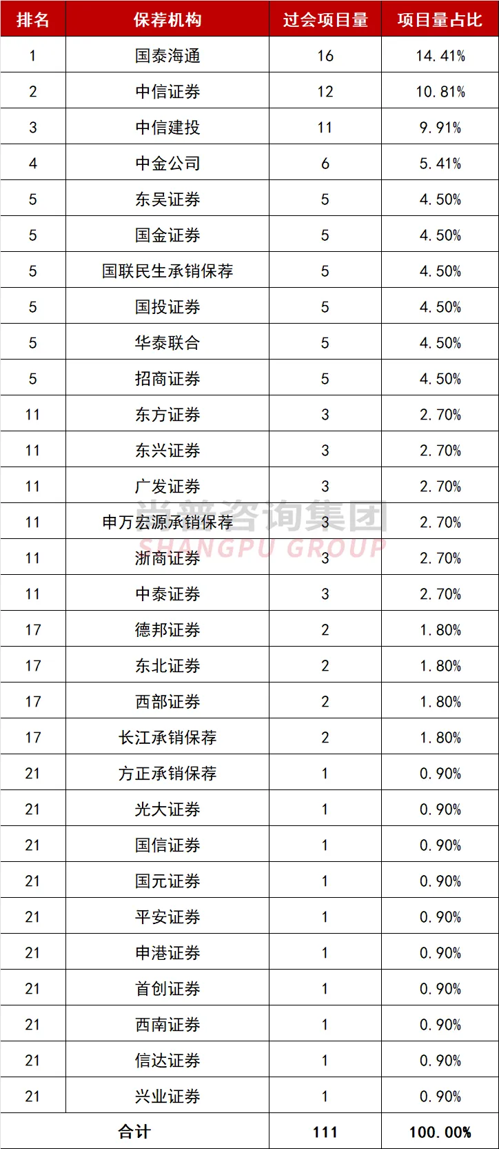 与2024年的100家相较,今年上市企业数量同比增长16%。中介机构方面,天健、容诚会所;中伦、锦天城律所分别为IPO过会、上市项目量榜首。国泰海通证券、银信评估则为“双榜”第一。以下为2025年1-12月中介机构IPO过会、上市项目数量排名(券商/会所/律所/评估机构):2025年1-12月,共有30家保荐机构承担了A股111家过会企业的保荐业务。排名前四的券商合计保荐过会项目量达到45单,占据四成市场。其中,国泰海通、中信证券、中信建投“领跑”!
