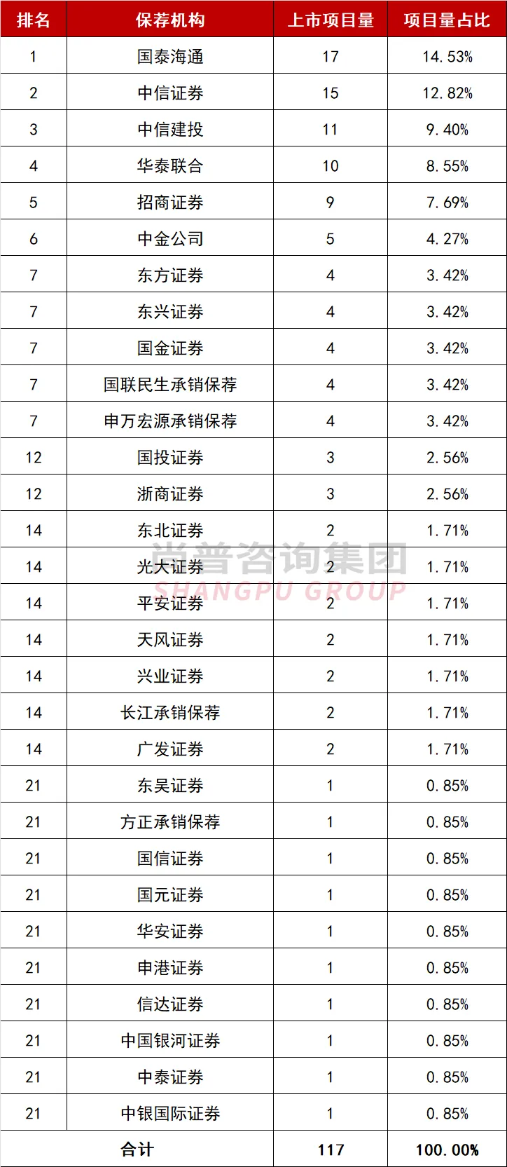 2025年1-12月,共有30家保荐机构承担了A股116家上市企业的保荐业务。以上5家券商占据“半壁江山”,合计保荐上市项目量达到62单。其中,国泰海通、中信证券、中信建投位列前三!
