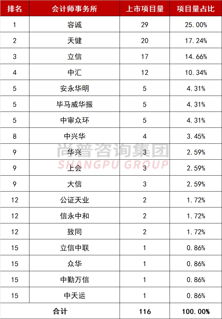 注:沪主板上市公司华电新能由中金公司和华泰联合两家券商联合保荐,各算一单,故总数为117。2025年1-12月,共有18家会计师事务所承担了A股116家上市企业的审计工作。并列第五:安永华明、毕马威华振、中审众环(各5单)排名前四的会所合计上市项目量达78单,占据近七成市场。其中,容诚独揽24单,稳居第一。