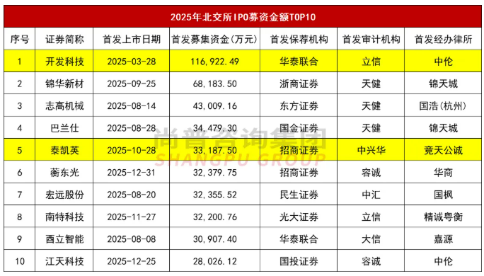 据尚普君统计,2025年北交所最大IPO为开发科技,募集资金11.69亿元。排名第二到第五,分别是锦华新材、志高机械、巴兰仕、泰凯英,分别募集资金6.82亿元、4.30亿元、3.45亿元、3.32亿元。