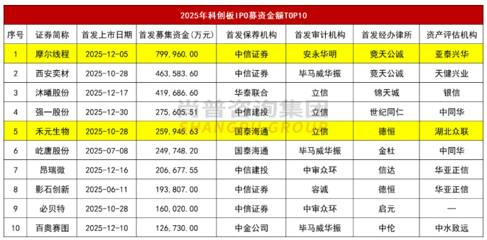值得注意的是,2025年科创板IPO募集资金总额排行前10企业中,尚普服务的客户占2席。本年度科创板最大IPO国产GPU龙头摩尔线程以及重启未盈利企业适用科创板第五套标准后首家上市的禾元生物均由尚普咨询提供专业IPO咨询服务,全程护航企业顺利登陆资本市场。