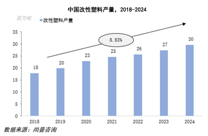 近年来,全球改性塑料产量呈现较好增长态势,我国改性塑料起步较晚,但受益于技术进步和消费升级,我国已成为全球塑料材料最大的消费市场,改性塑料行业得以快速发展。根据尚普咨询数据,2018年至2024年,我国改性塑料产量由0.18亿吨提升至0.3亿吨,年复合增长率为8.83%。
