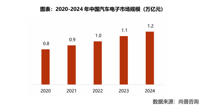 随着电动汽车的逐渐普及以及汽车电子在整车成本中的占比不断提高,我国汽车电子市场规模增速较快。根据尚普咨询整理,我国汽车电子市场规模从2020年的0.8万亿元增长到2024年的1.2万亿元,复合年均增长率为10.67%。