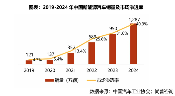 随着资源与环境双重压力的持续增大,在政策和技术进步的驱动下,新能源汽车已成为未来汽车工业发展的方向。根据中国汽车工业协会统计,2019年我国新能源汽车销量为121万辆,市场渗透率为4.7%,2024年销量增长至1,287万辆,市场渗透率达到40.9%,高于全球的19.1%。