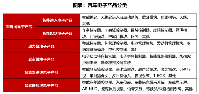 汽车电子于上世纪七十年代引入汽车工业,首次应用在发动机燃油喷射控制系统,极大改善了燃油效率。此后伴随着电子信息技术持续发展,汽车电子技术不断革新,汽车电子产品种类逐渐丰富。以智能网联汽车电子产品架构为例,根据功能与性质差异,汽车电子产品可以分为车身域电子产品、动力域电子产品、底盘域电子产品、智能驾驶域电子产品以及智能座舱域电子产品。