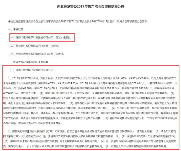 此次IPO并不是珠海赛纬第一次冲击资本市场。珠海赛纬首次冲刺资本市场始于2016年,当年11月17日,公司向中国证监会报送创业板IPO申报文件,12月2日预披露招股说明书。然而,在2017年9月13日中国证监会创业板发行审核委员会2017年第71次发审委会议上,公司IPO申请未获通过,首次闯关失败。 此次发审委核心问询围绕公司与第一大客户兼第一大供应商沃特玛的合作展开,同时关注收入确认相关问题,具体可总结为两大核心方向: 1.合理性与重要性:说明沃特玛既是第一大客户(2015-2017年1-6月销售收入占比11.63%、45.93%、47.46%)又是第一大供应商(2017年1-6月采购占比47.98%)的合理性、必要性,以及对公司后续经营的重要性。 2.款项抵扣的会计影响:公司向沃特玛采购六氟磷酸锂的款项直接从应收销售款项中抵扣,需说明该操作对报告期现金流量表、利润表的影响,以及相关会计处理是否准确反映经济业务。 3.定价合理性与合作模式实质:解释向沃特玛采购六氟磷酸锂价格远高于市场平均价的原因,说明销售产品定价方式,并据此判断合作模式属于商品买卖还是委托加工;同时说明原材料价格波动是否影响销售价格,结合风险和报酬转移条件进一步明确交易实质。 4.经营依赖风险:从销售、采购双维度分析公司生产经营对沃特玛是否存在依赖。 1.收入确认政策一致性:结合与沃特玛的采购订单、销售补充协议,说明报告期实际执行的收入确认政策(合同约定发货后买方签收验收合格或验收期满无异议确认收入)与披露政策是否一致,同时说明2015年度与沃特玛销售业务的首次确认时间。 2.商业承兑汇票列报:说明报告期末已背书或贴现但资产负债表日尚未到期的商业承兑汇票的列报方式。 3.合作可持续性与交易实质:进一步说明与沃特玛销售、采购业务的可持续性及交易实质。 此外,发审委均要求保荐代表人对上述所有问题发表核查意见,其中针对收入确认还特别要求核查收入确认政策披露的充分性、准确性,以及与收入确认相关的内部控制有效性。 时隔五年后,珠海赛纬再次启动IPO进程。2023年9月15日,公司获深交所上市委审议通过,但此后迟迟没有进展,直至此次主动撤回而终止。 第二次IPO上会审核时,上市委会议现场问询的核心内容聚焦珠海赛纬两大关键问题: 1.客供配方模式的核心价值与合作可持续性问题:发行人主营锂离子电池电解液研发、生产和销售,核心客户宁德时代、亿纬锂能等自身具备电解液配方体系,报告期内客供配方模式收入占比分别为48.17%、48.05%、46.80%。监管层要求发行人说明核心技术、工艺流程在客供配方产品生产中的具体应用;结合电解液生产准入门槛与竞争壁垒,说明该模式下与核心客户合作的稳定性、可持续性及被替代风险,并要求保荐人发表明确意见。 2.2023年业绩下滑成因与持续风险问题:发行人2023年上半年营业收入5.93亿元(同比降46.00%)、扣非归母净利润5475.44万元(同比降56.90%),预计全年销售收入17.08亿元(同比降6.94%)、扣非归母净利润1.22亿元(同比降40.32%)。监管层要求发行人结合市场需求、原材料及产品价格波动、同行业可比公司情况,说明上半年业绩大幅下滑原因、全年盈利预测编制的审慎合理性,以及业绩是否存在持续下滑风险、经营环境是否出现重大不利变化,并要求保荐人发表明确意见。