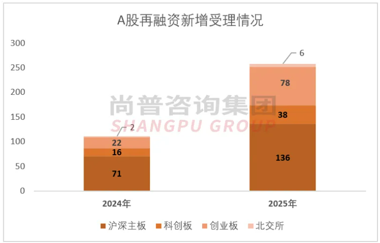 据沪深北交易所官网显示,2025年三大交易所共计受理258家上市公司的再融资申请,其中,主板136家、科创板38家、创业板78家、北交所6家。新增受理量较2024年大幅增长132.43%。