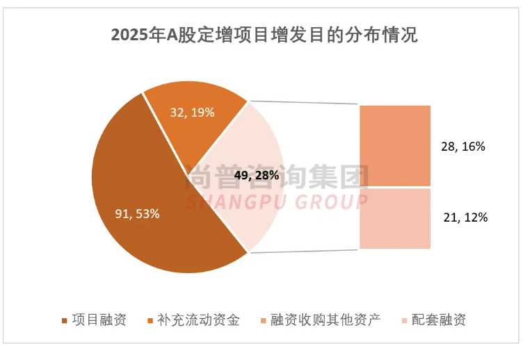 Wind数据显示,2025年完成发行上市的再融资企业共计167家(以上市日为统计口径),其中增发123家、可转债44家,累计融资额达7,699.25亿元。2025年度A股无配股及优先股融资。增发方面(不含融资收购资产及配套融资),2025年123家上市发行的企业均为定向增发,成为A股再融资市场的绝对主导力量。从募资规模来看,国有大型银行的定增项目获财政部与监管层支持,4家银行合计融资规模达5200亿元,且均用于补充流动资金。其中,中国银行以1650亿元的融资额成为2025年“定增王”;另,邮储银行募资1300亿元、交通银行募资1200亿元、建设银行募资1050亿元。在剔除四家银行大额定增后2025年发行规模为1,867.92亿元,相较2024年上升61.75%。此外,在“并购六条”政策推动下,借助定增收购资产以拓宽业务版图的上市公司也不在少数。Wind数据显示,2025年在已完成的172单定向增发案例中(含融资收购资产及配套融资),有28单为融资收购其他资产,21单为配套融资,两者占比近三成。