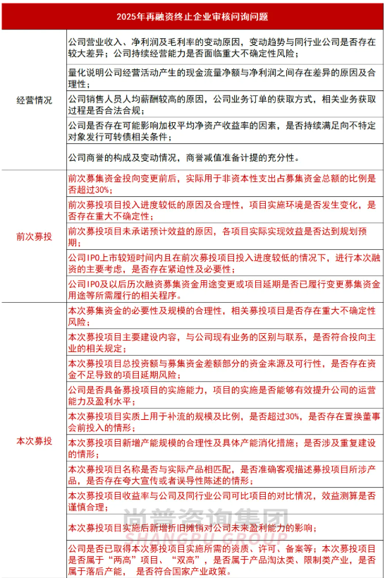 根据现有公开问询函披露,对于终止企业,再融资审核过程中问询重点主要涉及公司经营情况、募投情况、资产及财务性投资情况、同业竞争及关联交易情况等方面。其中,募投项目始终是监管层的核心关注点:公司前次募投项目的实施效果,包括项目进度、效益测算、变更情况等;本次募资的合理性与必要性、是否投向主业、新增产能及消化情况、非资本性支出占比等成为高频问题。值得一提的是,深交所于2025年6月发布《发行上市审核业务指引第8号——轻资产、高研发投入认定标准》,符合标准的上市公司不再受30%补流限制,利好创业板后续再融资,促进科技型上市公司做优做强,服务新质生产力发展。
