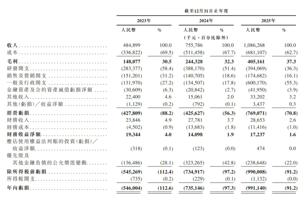 招股书显示,2023年至2025年,思谋科技实现营业收入分别为4.85亿元、7.56亿元和10.86亿元,呈现持续快速增长态势,年均复合增长率接近50%。同期归属于母公司股东的净亏损分别为5.46亿元、7.35亿元和9.91亿元,三年累计亏损达22.72亿元。尽管亏损额逐年扩大,但公司毛利率持续改善,分别为30.5%、32.3%和37.3%,显示出产品结构优化及规模效应带来的盈利潜力。