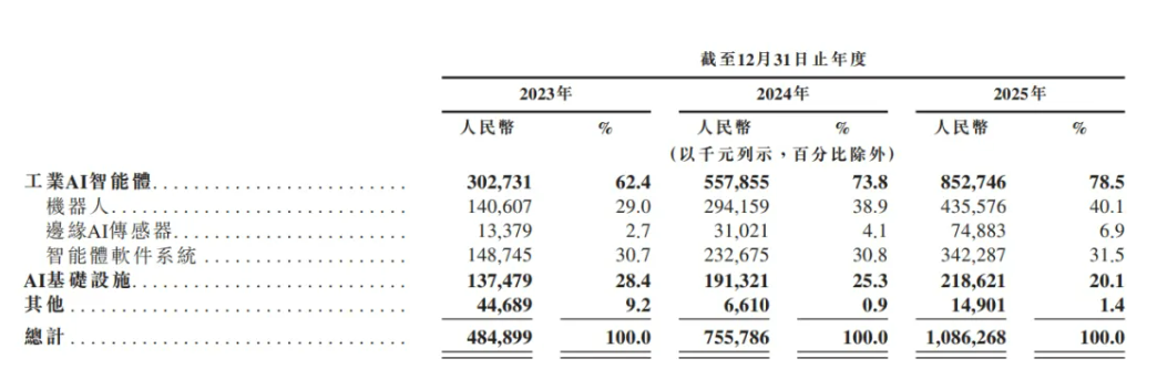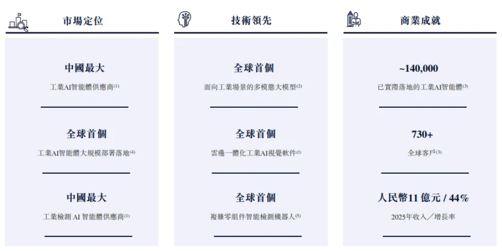 凭借深厚的技术积累,思谋科技已服务特斯拉、卡尔蔡司、立讯精密、歌尔股份、京东方、中国中车、中创新航及科达利等全球头部工业企业。截至2025年末,公司累计交付约14万个工业AI智能体,其机器人已完成超170亿件产品或零部件的检测。按2025年收入计,思谋科技是中国收入规模最大的工业AI智能体提供商,市场份额达5.8%。
