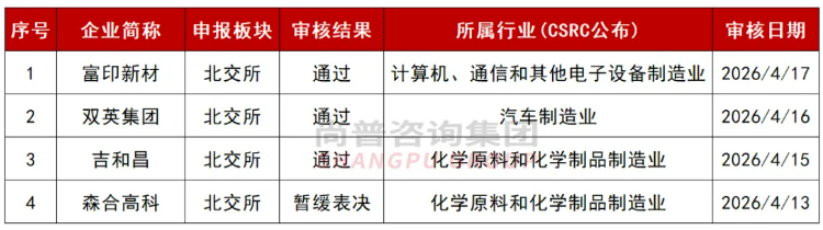 根据中国证监会、沪深北交易所官网信息显示,4月11日-4月17日,IPO:5家企业启动辅导备案,2家获受理,3家通过审核、1家暂缓,2家获注册批文,5家上市,2家终止。再融资:7家获受理、2家通过审核、1家终止。并购重组:1家获受理,1家通过审核。