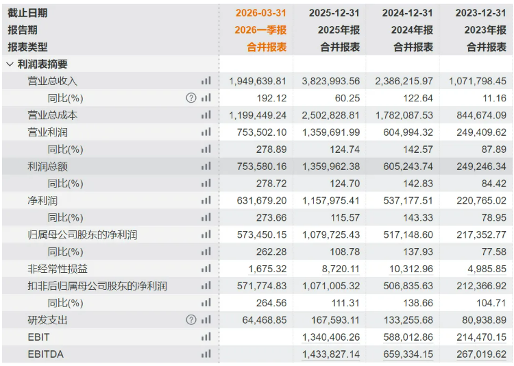 回看2025年全年,公司营收达382.40亿元,同比增长60.25%;归母净利润107.97亿元,同比增幅高达108.78%,正式迈入“百亿净利俱乐部”。