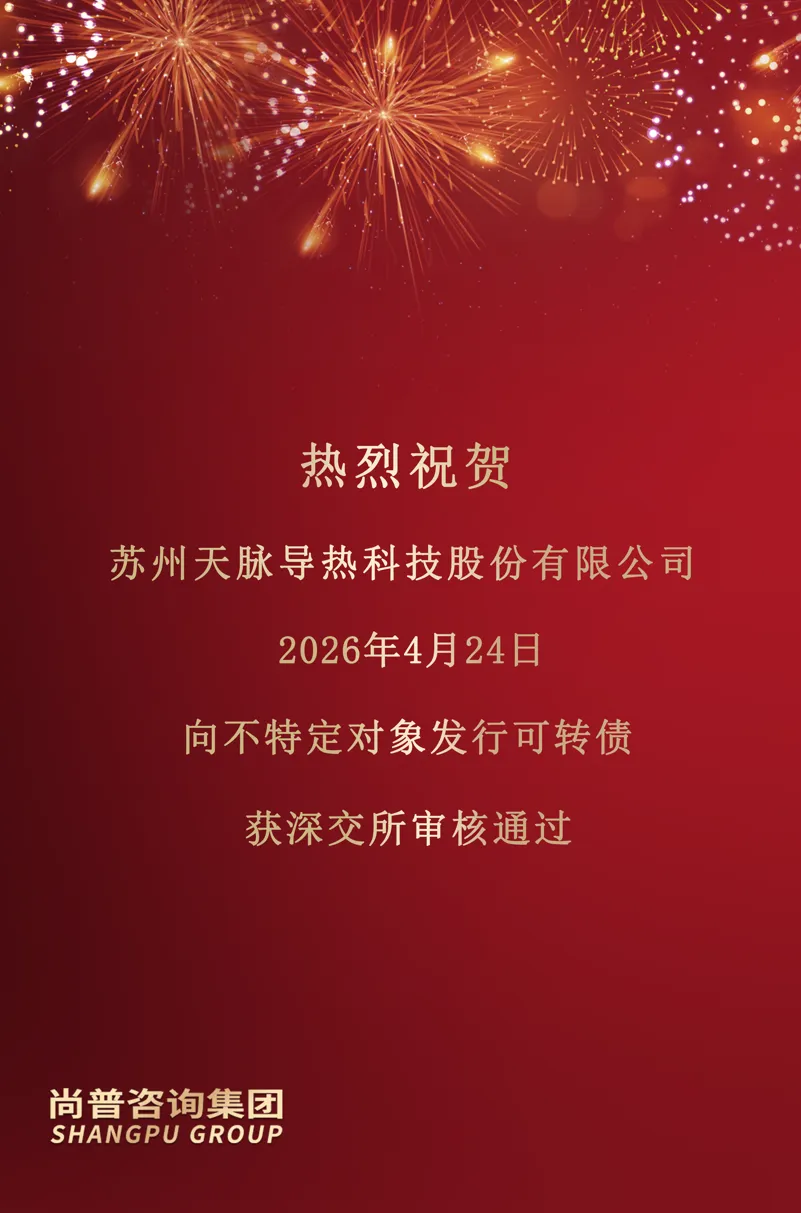 2026年4月24日,苏州天脉导热科技股份有限公司(证券简称:苏州天脉,证券代码:301626)向不特定对象发行可转债通过深交所审核。尚普咨询底稿团队为苏州天脉此次再融资提供了工作底稿整理服务。
