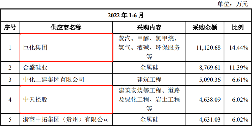 此外,根据衢州市应急管理局出具的《行政处罚决定书》,中天氟硅“11·9”事故未造成人员伤亡,直接经济损失498.9万元,该事故是生产安全责任事故,属一般事故,对公司处50万元罚款的行政处罚。根据衢州市应急管理局于2022年2月17日出具的《证明》,中天氟硅已对前述违法事项积极整改完毕,并按时缴纳了全部罚款,相关违法行为造成的不良影响已全部消除,未导致严重环境污染、重大人员伤亡和社会影响恶劣等严重后果。上述行政处罚不属于针对重大违法行为的行政处罚及较大重大事故行政处罚,所涉违法行为不属于重大违法行为及较大重大事故违法违规行为。除了这次重大的火情之外,中天氟硅还在招股书中披露了其他三起行政处罚:1、公司受到的环保处罚情况。因公司建设的2万吨/年甲基乙烯基硅橡胶及混炼胶项目中混炼胶项目固废未完成环境保护设施竣工验收,违反《建设项目环境保护管理条例》第十九条第一款规定,衢州市生态环境局于2021年5月25日对公司出具了《行政处罚决定书》(衢环智造罚字[2021]3号),要求公司限期改正违法行为,并处罚款41万元。2、公司受到的消防部门行政处罚情况。因公司违章搭建钢棚占用防火间距,违反《中华人民共和国消防法》第二十八条和《浙江省消防行政处罚裁量标准》第五条规定,衢州市消防救援支队柯山大队于2021年6月28日对公司出具了《行政处罚决定书》(衢柯山(消)行罚决字[2021]0019号),处罚款2万元。3、公司受到的职业健康行政处罚情况。因公司未按照规定对有职业禁忌的劳动者调离或者暂时脱离原工作岗位,违反《用人单位职业健康监护监督管理办法》第二十六条第(五)项规定,衢州市卫生健康委员会于2020年10月28日对公司出具了《行政处罚决定书》(衢卫职罚[2020]1号),给予警告,并处罚款1.5万元。虽然以上行政处罚并不属于重大违法违规行为,但事故频发的背后,发行人的内控能力不得不让人有所怀疑。除了内控缺失外,中天氟硅与关联方存在大量采购交易,也暴露出不小的风险。上文提到,中天氟硅的股权结构十分集中,中天控股集团合计控制95%股份,为控股股东。巨化集团持有其5%的股份,为第二大股东。但令人惊讶的是:中天控股和巨化集团竟然还是发行人重要的供应商。2022年上半年,巨化集团和中天控股分别为其第一、四大供应商,中天氟硅向两家公司进行的采购金额分别为1.11亿元、4,639.09万元。2021年巨化集团和中天控股则为发行人第三和第二大供应商,中天氟硅向两家公司进行的采购金额分别为1.64亿元和1.68亿元。中天氟硅向巨化集团的采购内容主要包括蒸汽、甲醇、氯甲烷、氢气、液碱、环保服务等,向中天控股采购建筑安装等工程、道路及绿化工程、岩土工程等。除重合供应商外,中天氟硅与前述关联方还存在重合客户的情况。据招股书显示,报告期内,发行人与巨化集团下属企业存在客户重合情况,重合客户的销售金额分别为1.58亿元、1.55亿元、2.08亿元和1.76亿元,占各期营业收入的比例分别为16.28%、17.37%、16.97%和23.60%,有逐渐上升的趋势。