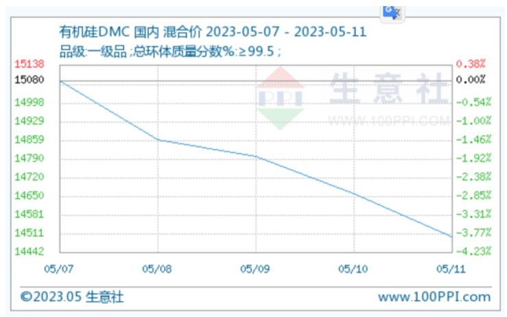 如果说营业收入和净利润的下滑还不够有说服力,那发行人的毛利率则彻底暴露了企业业绩下滑的趋势。根据下图,可以看到发行人的毛利率从2021年的38.68%一路跌到了2022年上半年的19.64%,跌幅明显。发行人在招股书中也坦言:2022年1-6月,公司综合毛利率较2021年下降19.04个百分点,主要原因系2021年11月起,有机硅DMC价格整体呈大幅下降趋势,其中2022年1-6月呈现先上涨后下跌的较大幅度变动趋势,DMC销售单价总体低于2021年度;同时公司主要产品单位成本因单位直接材料影响有所上升,上述原因使得综合毛利率有所下降。而业绩下滑的背后,是有机硅DMC市场的骤变。在申报材料中,中天氟硅明确指出:其所属的有机硅上游单体企业主要以单体和中间体生产为主,近年来逐步延伸至107胶和110生胶、混炼胶等初级深加工产品,产品结构相对单一,企业利润水平主要受DMC市场价格变动影响。2021年10月上旬,有机硅DMC出厂均价不断上涨,这促使中天氟硅有机硅产品价格水涨船高,从而带动2021年收入大涨。然而从2021年11月起,受上下游工序变化和国家政策的影响,有机硅DMC开启了漫长的大幅下跌趋势。虽然中天氟硅并没有公布2022年全年的财务数据,但从其2022年上半年的情况和有机硅DMC市场价格继续深跌的趋势大概可以推断,中天氟硅在2022年下半年所遭遇的情况可能比上半年还要严峻。根据生意社监测数据显示,有机硅DMC2022年下半年至今价格下跌一路不停,截止2023年5月11日,国内有机硅DMC市场价格参考在14500元/吨,较5月7日(有机硅DMC参考15080元/吨)价格下调580元/吨,跌幅3.85%。有机硅DMC市场整体气氛改善不佳,下游需求谨慎,需求支撑依旧松动为主,截止5月11日,国内有机硅DMC市场价格参考14300-14800元/吨附近。要知道在2021年10月,有机硅DMC市场曾一度突破历史高价达到5万-6万/吨。今昔不同往日,随着行业的骤变,一切都化为了幻影。罗马城不是一日建成的,IPO之路也并非一朝幻灭的。内控问题频发、关联交易丛生都是企业绕不开的难题,而有机硅DMC连续不断的下跌终究直接导致了中天氟硅梦断于此。全面注册制,更加考验拟IPO企业的业绩,资本市场优胜劣汰的局面也将继续。中天氟硅的经历不得不让人慨叹:成也有机硅DMC,败也有机硅DMC,一个企业的命运,不仅要看企业的奋斗,还要考虑时代和行业的进程。