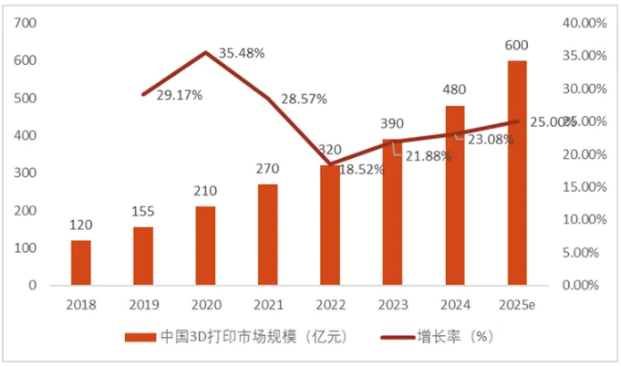 图表:2018-2025年我国3D打印行业市场规模及年增长率