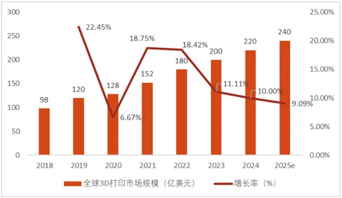 图表:2018-2025年全球3D打印行业市场规模及年增长率